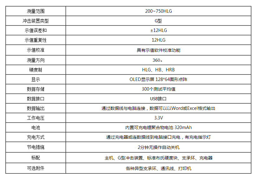 标配 | 主机、G型冲击装置、标准布氏硬度块、支承环、充电器 |