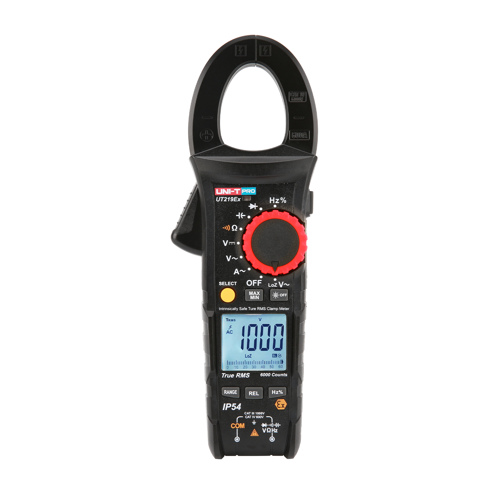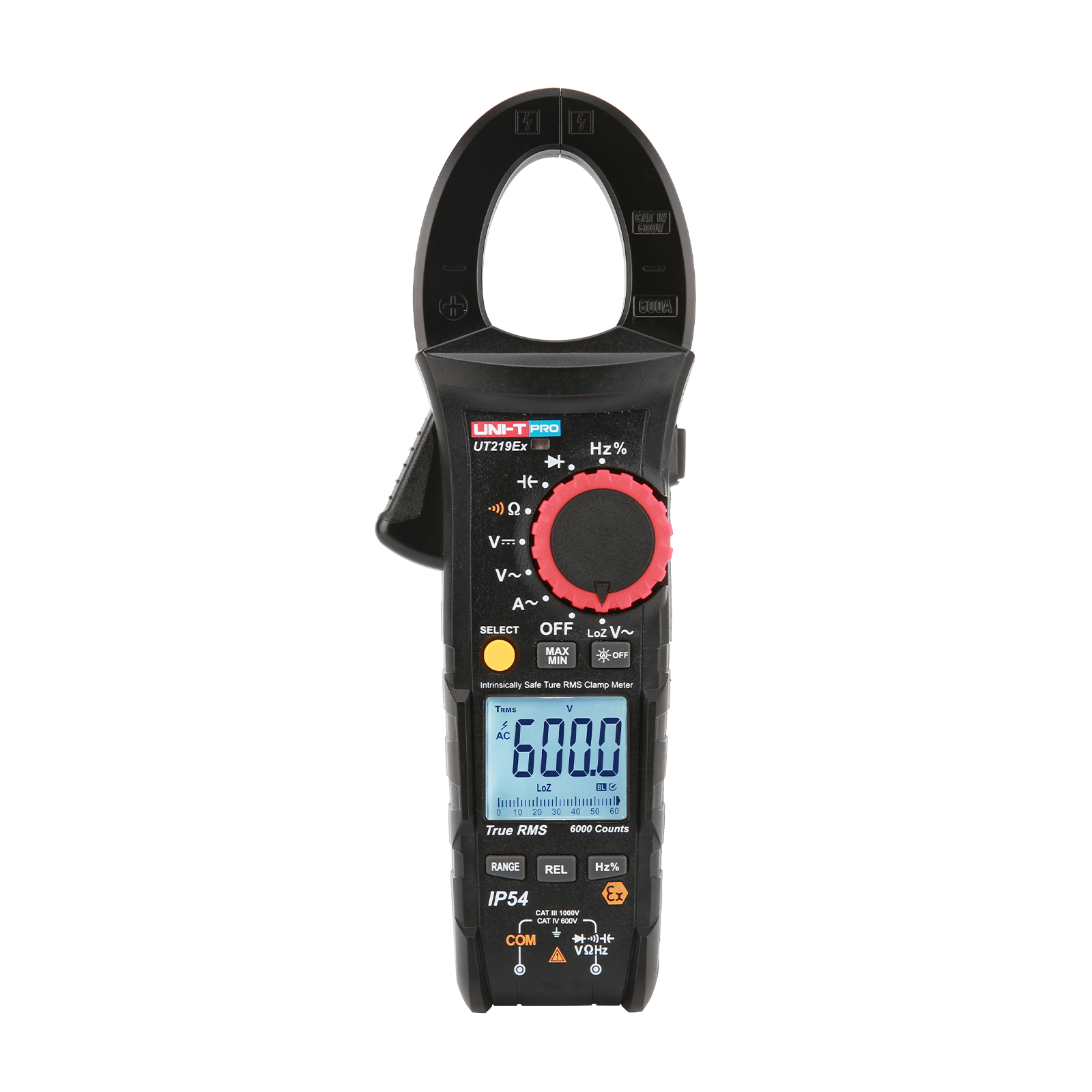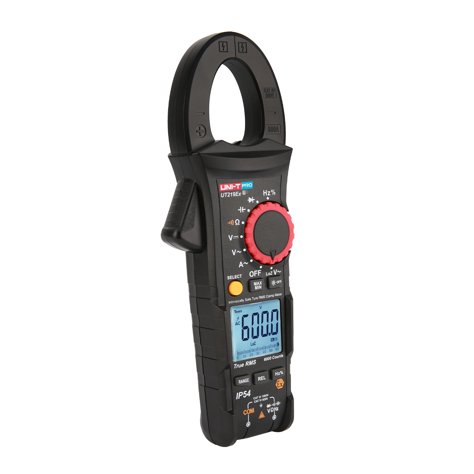 UT219Ex本安型工业防爆钳形表是一款可用于IIC(气体) 0区、1区和2区以及IIIC(粉尘) 20区、21区和22区的本质安全型手持式工业数字钳形表。它不仅具备传统钳形表测量交直流电压、交流电流、电阻、二极管、电路通断、电容、频率、占空比等功能,同时还具备防水、防尘、耐摔等特点,它符合CAT III 1000V/CAT IV600V安全等级,并获得了国家Ex ia IIC T4 Ga等防爆认证, 广泛用于石油环境、化工环境、制药环境等强电场环境中检测、维护和维修 电路电力设备,对测试数据进行分析排除线路故障功能。